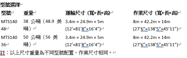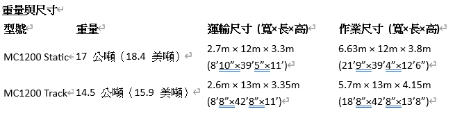 重量與尺寸(依機型) MS100(最大型) •重量:17.5 公噸(19.2 美噸) •運輸寬度:2.26 m(7’5”) •運輸長度:16.8 m(55’4”) •運輸高度:4.3 m(14’3”) •作業寬度:6.3 m(22’3”) •作業長度:30 m(100’) •作業高度:12 m(39’1”) MS30: •重量:2 公噸(2.3 美噸) •運輸寬度:2.5 m(8’) •運輸長度:7.8 m(25’7”) •運輸高度:3.2 m(10’10”) •作業寬度:3.5 m(11’4”) •作業長度:9 m(30’) •作業高度:4.6 m(15’1”) MS40: •重量:2.9 公噸(3.3 美噸) •運輸寬度:2.5 m(8’) •運輸長度:8.6 m(28’2”) •運輸高度:3.7 m(12’2”) •作業寬度:3.5 m(11’4”) •作業長度:12 m(40’) •作業高度:5.6 m(18’2”) MS50: •重量:2.9 公噸(3.3 美噸) •運輸寬度:2.5 m(8’) •運輸長度:12.6 m •運輸高度:3.9 m(12’9”) •作業寬度:3.5 m(11’4”) •作業長度:15 m(50’) •作業高度:7.6 m(25’) MS65: •重量:4 公噸(4.45 美噸) •運輸寬度:2.5 m(8’) •運輸長度:11.9 m(38’9”) •運輸高度:4.1 m(13’4”) •作業寬度:3.5 m(11’4”) •作業長度:20 m(65’) •作業高度:9.2 m(30’2”) MS80: •重量:7 公噸(7.71 美噸) •運輸寬度:3.96 m(12’1”) •運輸長度:17.6 m(58’) •運輸高度:4.1 m(13’7”) •作業寬度:3.9 m(12’9”) •作業長度:24 m(80’) •作業高度:11.5 m(37’10”) 選配項目 •輸送帶長度:30 呎(9 m)至 100 呎(30 m) •動力來源選項: o 液壓聯接 o 柴油發電機組 o 電力 / 液壓 o 直接電力驅動 o 柴油動力模組 •多種輸送帶寬度與帶型可選 •緊急拉繩安全裝置 •動力放射輪驅動系統 •液壓頭部折疊功能 •全長、半長或四分之一長度橡膠側裙可選 •進料斗延伸裝置 •多款進料斗耐磨襯板